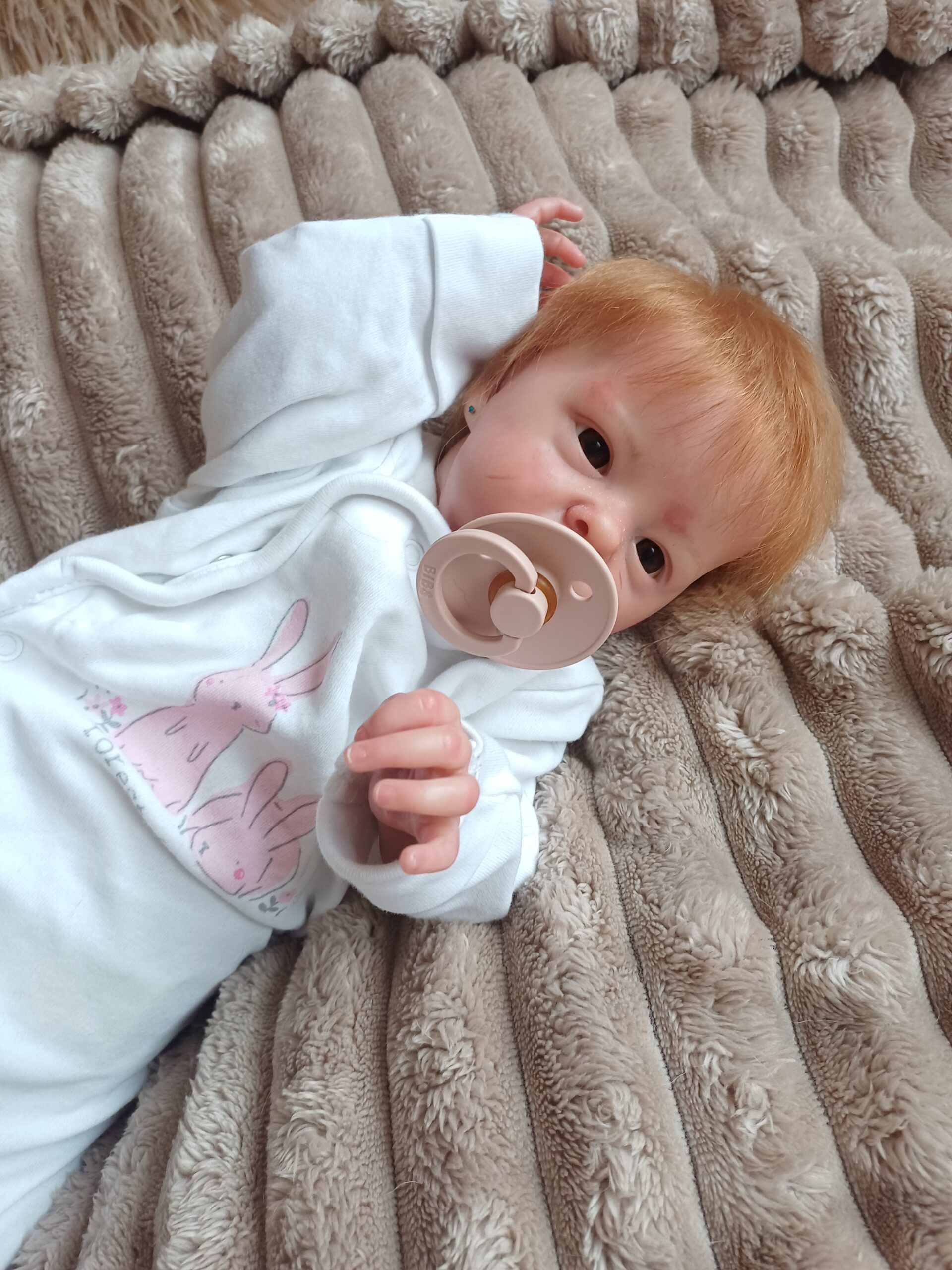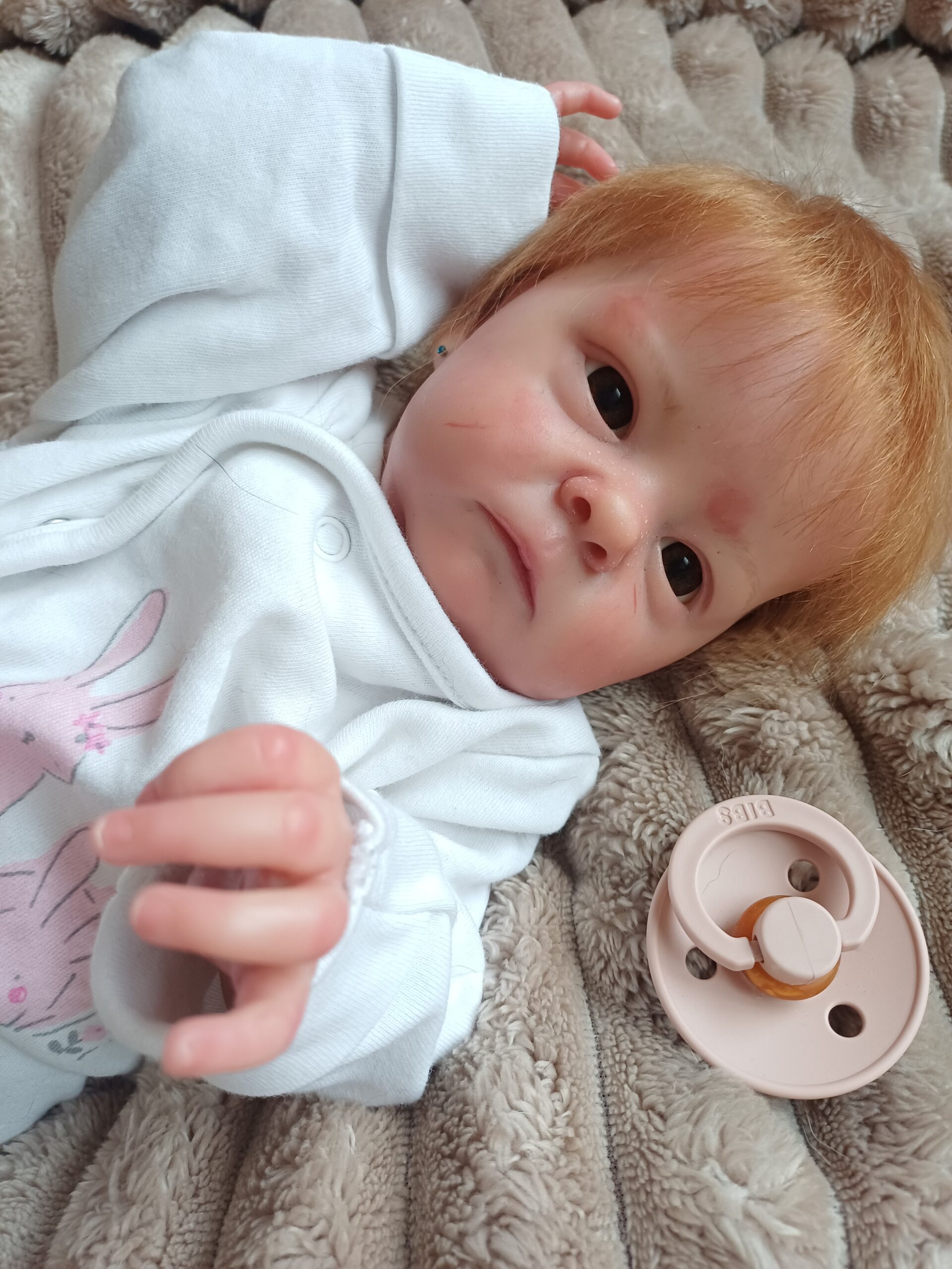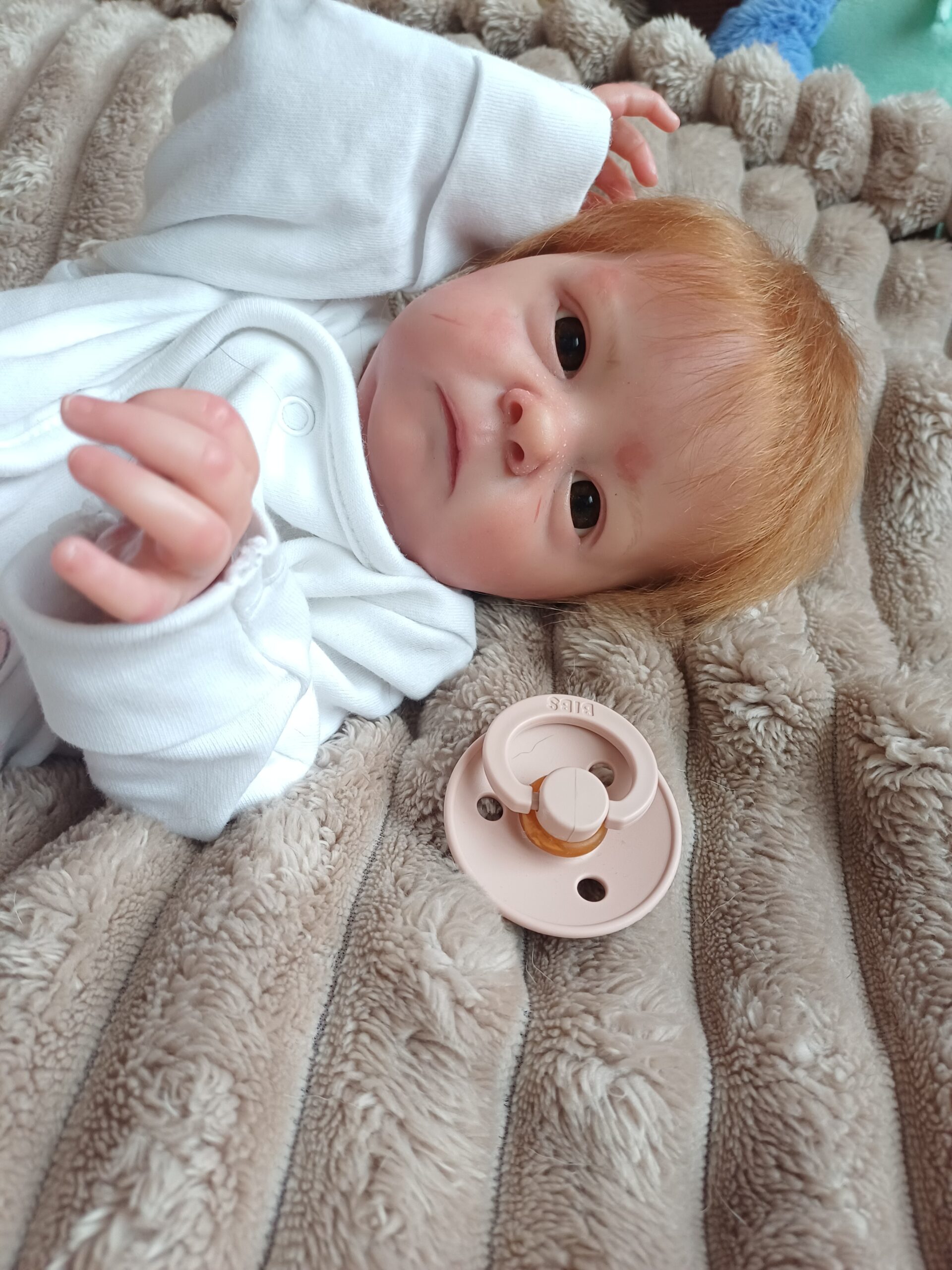El pelo está injertado a mano, mechón a mechón sobre el vinilo del cuero cabelludo, y sus ojos son de cristal, dos de los acabados que más realismo aportan a un bebé reborn y que requieren mayor dedicación en el proceso de elaboración.