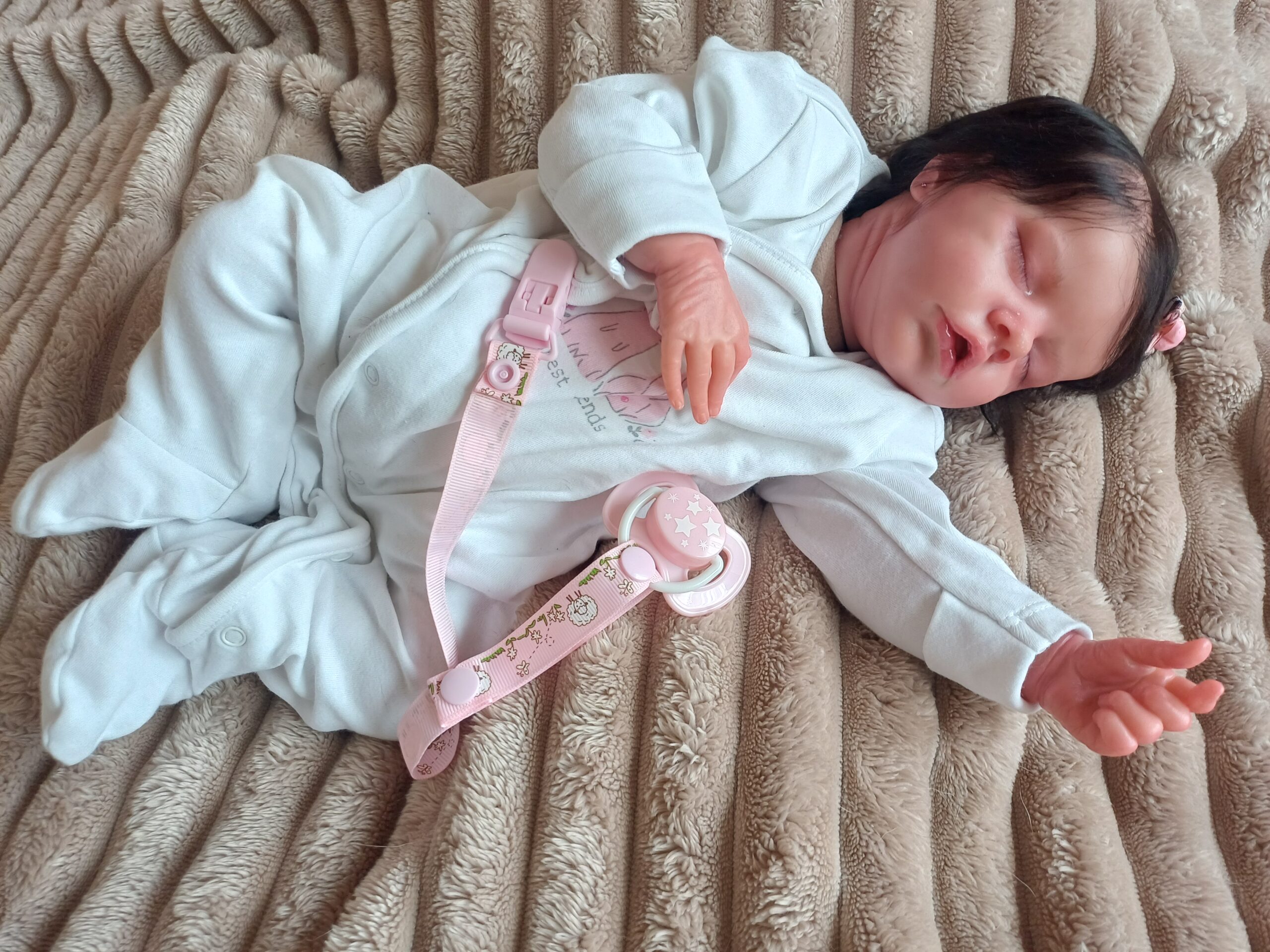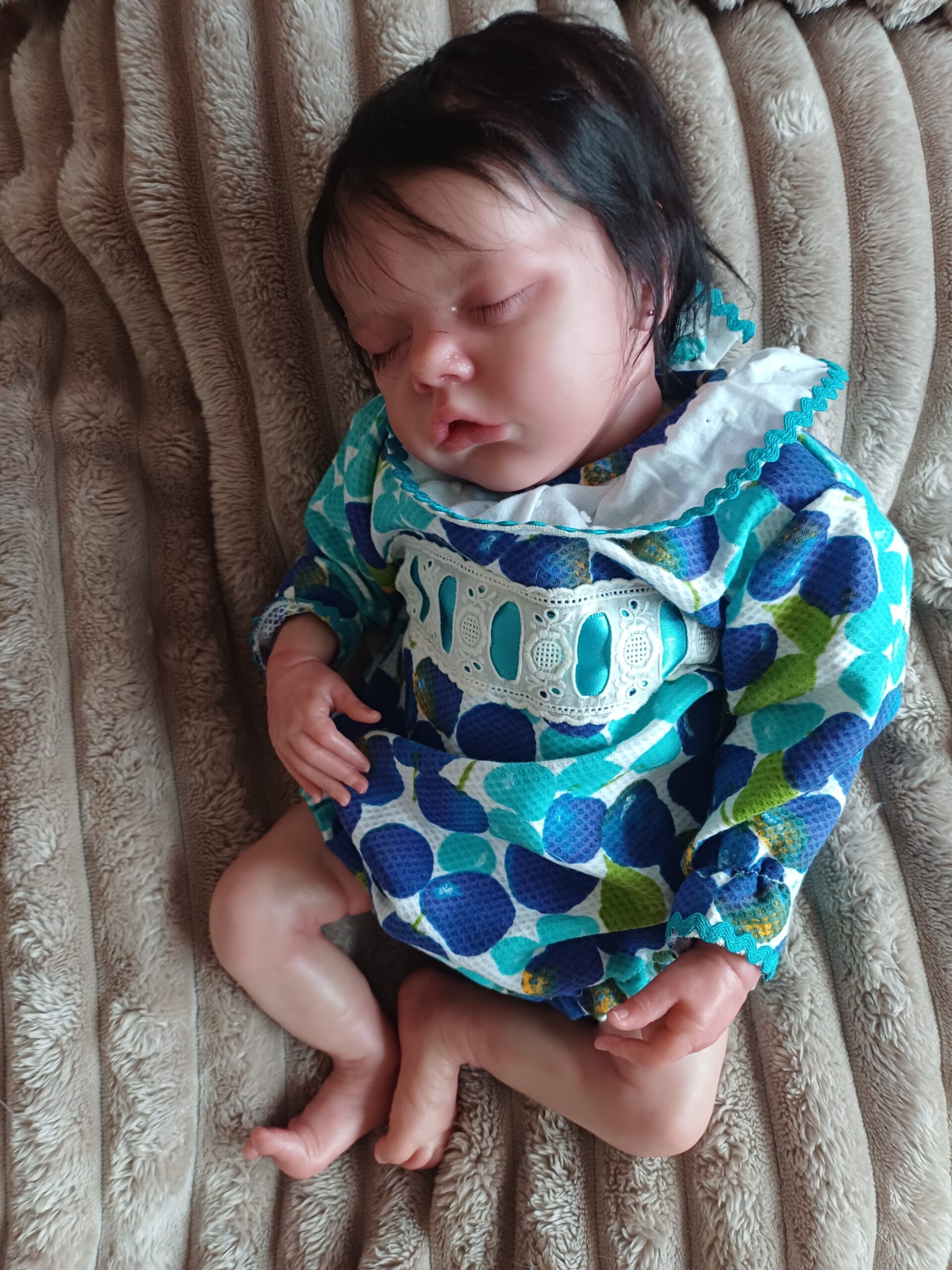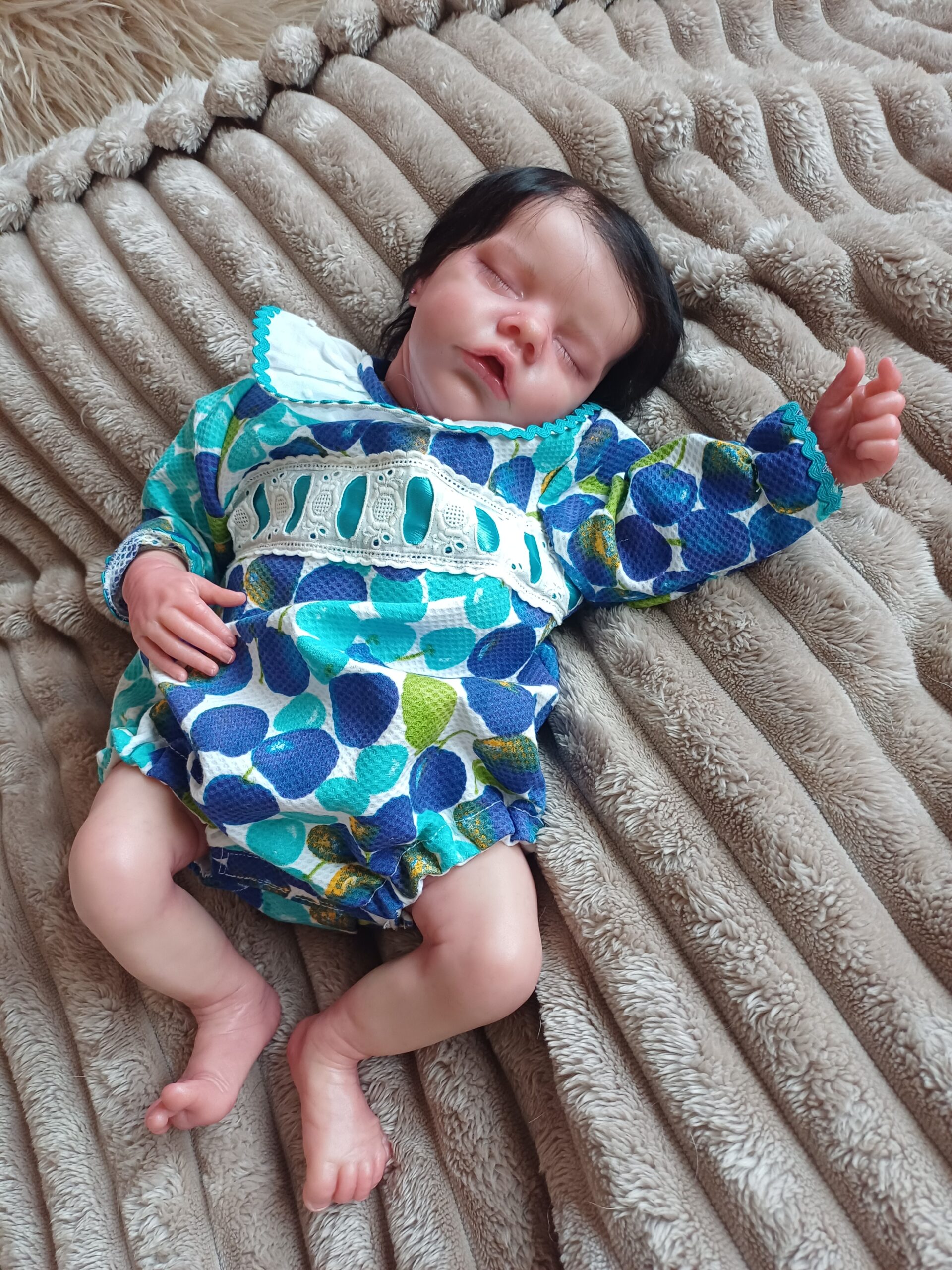 Su piel ha sido trabajada con pinturas Genesis Heat Set en capas sucesivas, consiguiendo ese efecto de piel de bebé real con profundidad de tono, transparencia y los matices únicos que hacen que cada pieza artesanal de Nieves sea irrepetible.